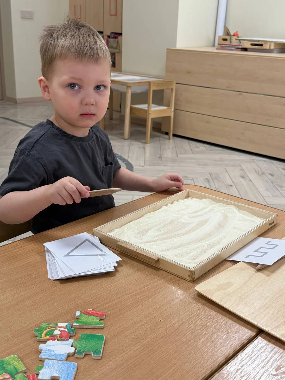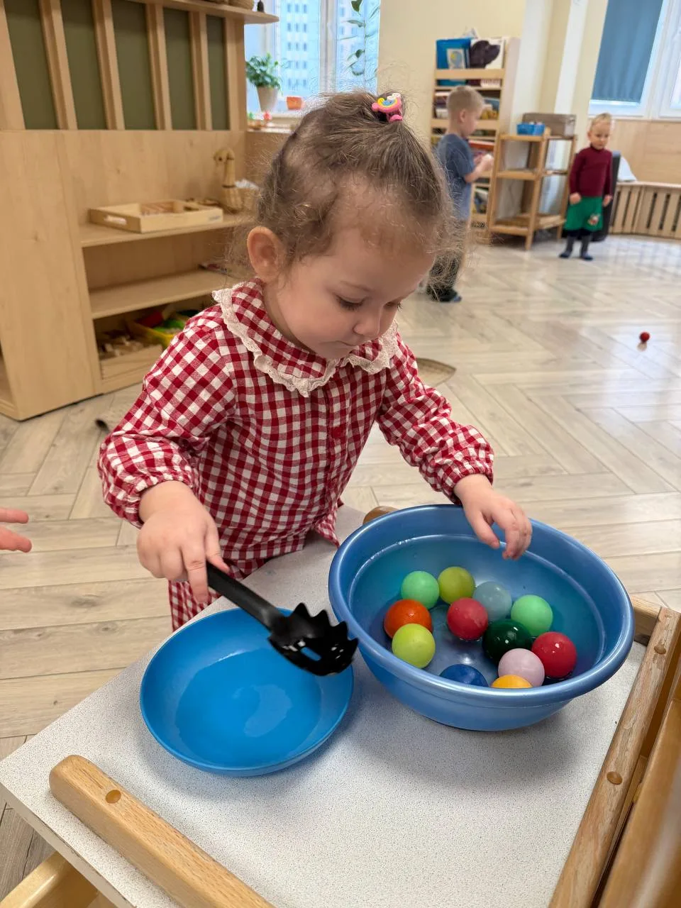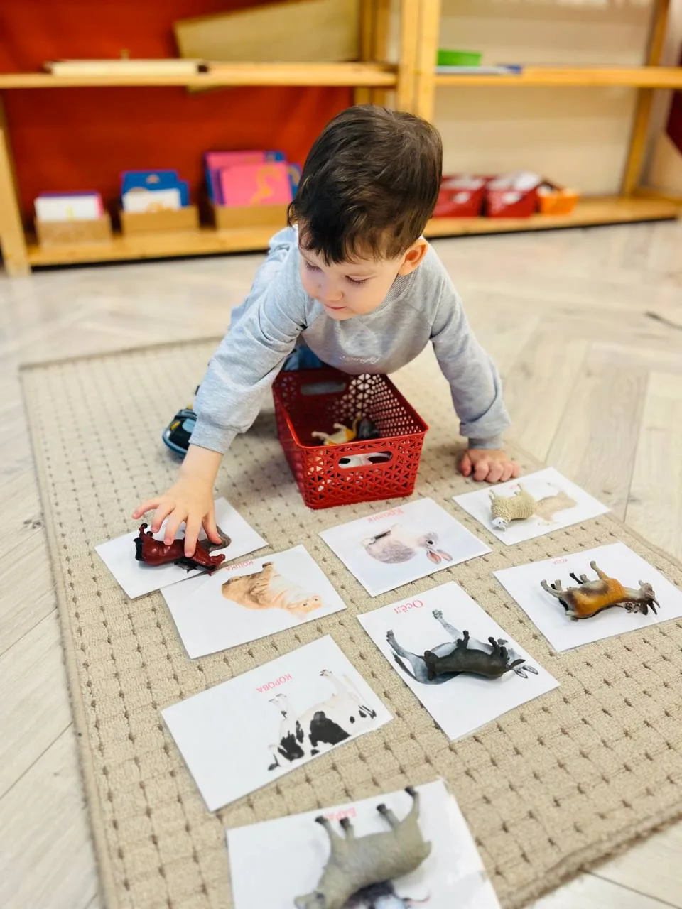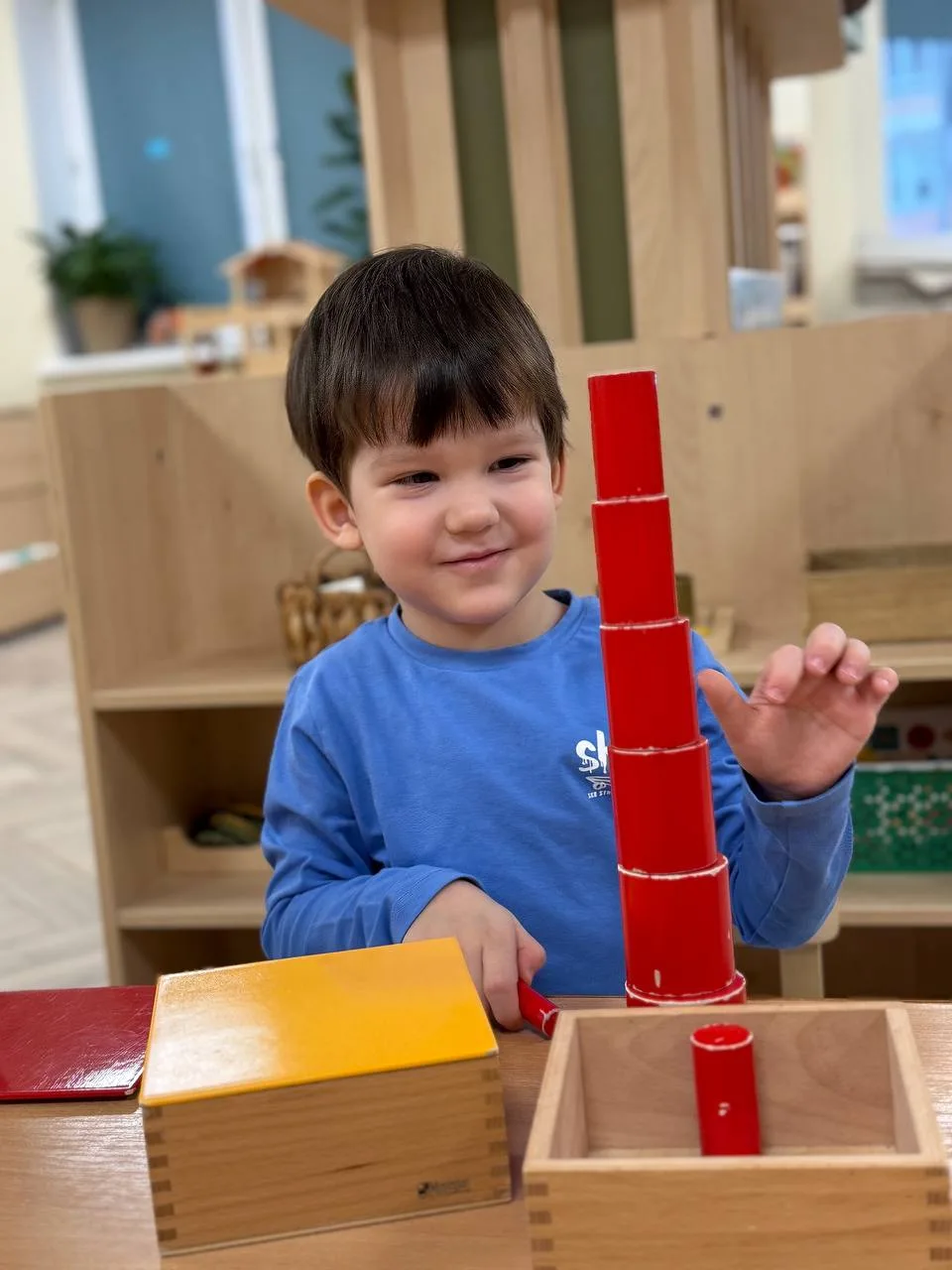 Занятие длится 1 час 50 минут и проходит без родителей. За это время ребята активно занимаются в развивающей среде с Монтенссори материалом, направленным на развитие: